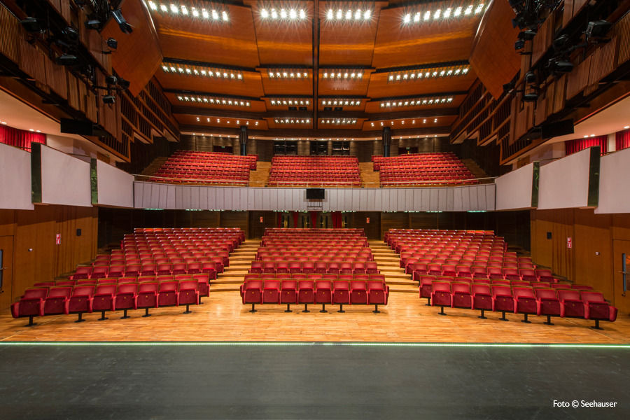 Dieser mehrfach nutzbare Saal eignet sich für die verschiedensten Events und Veranstaltungen: Opern, Theater, Musicals, Tanzaufführungen, Konzerte und Kabarett. Parkett und Galerie umfassen insgesamt 802 Sitzplätze in elegantem roten Stoff. Die Bühne ist von jeder Position aus sehr gut überblickbar. Die Struktur ist mit modernster Technik ausgestattet und bietet auch eine kompetente technische Betreuung an.