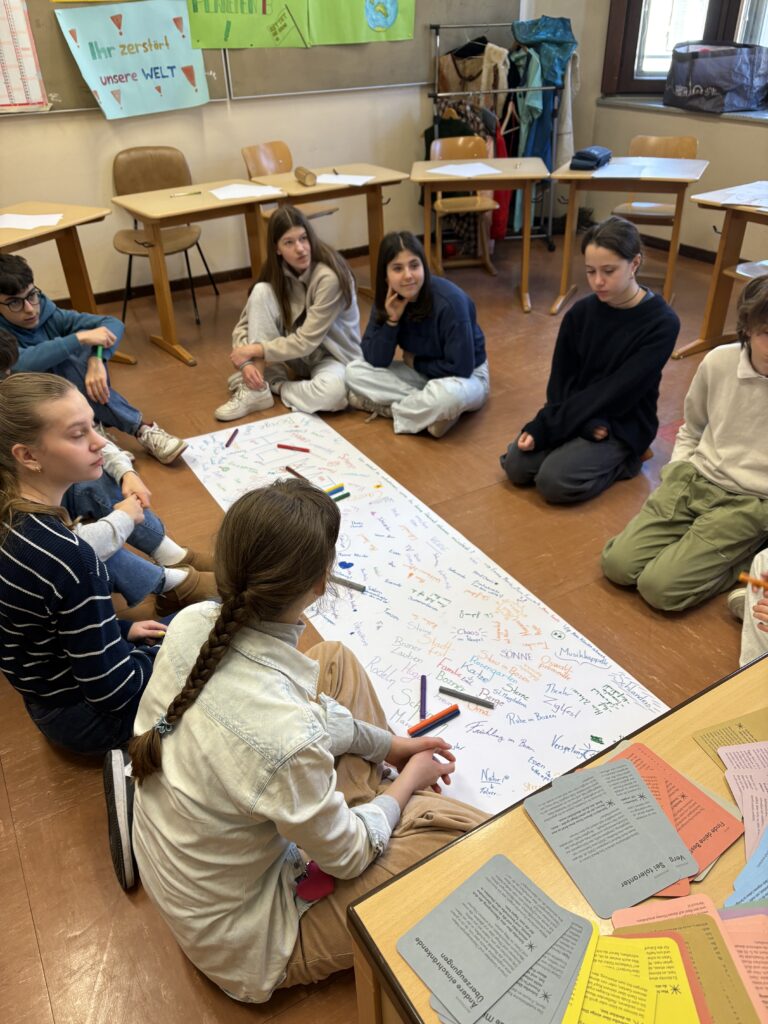 In einer Schreibwerkstatt unter der Leitung von Theaterpädagogin Nadja Tröster entwickeln interessierte Schüler:innen der 2. und 3. Klassen der Mittelschule Josef v. Aufschnaiter selbst ein Theaterstück. Entstanden ist die Geschichte „Ein Platz voller Möglichkeitsmenschen“: