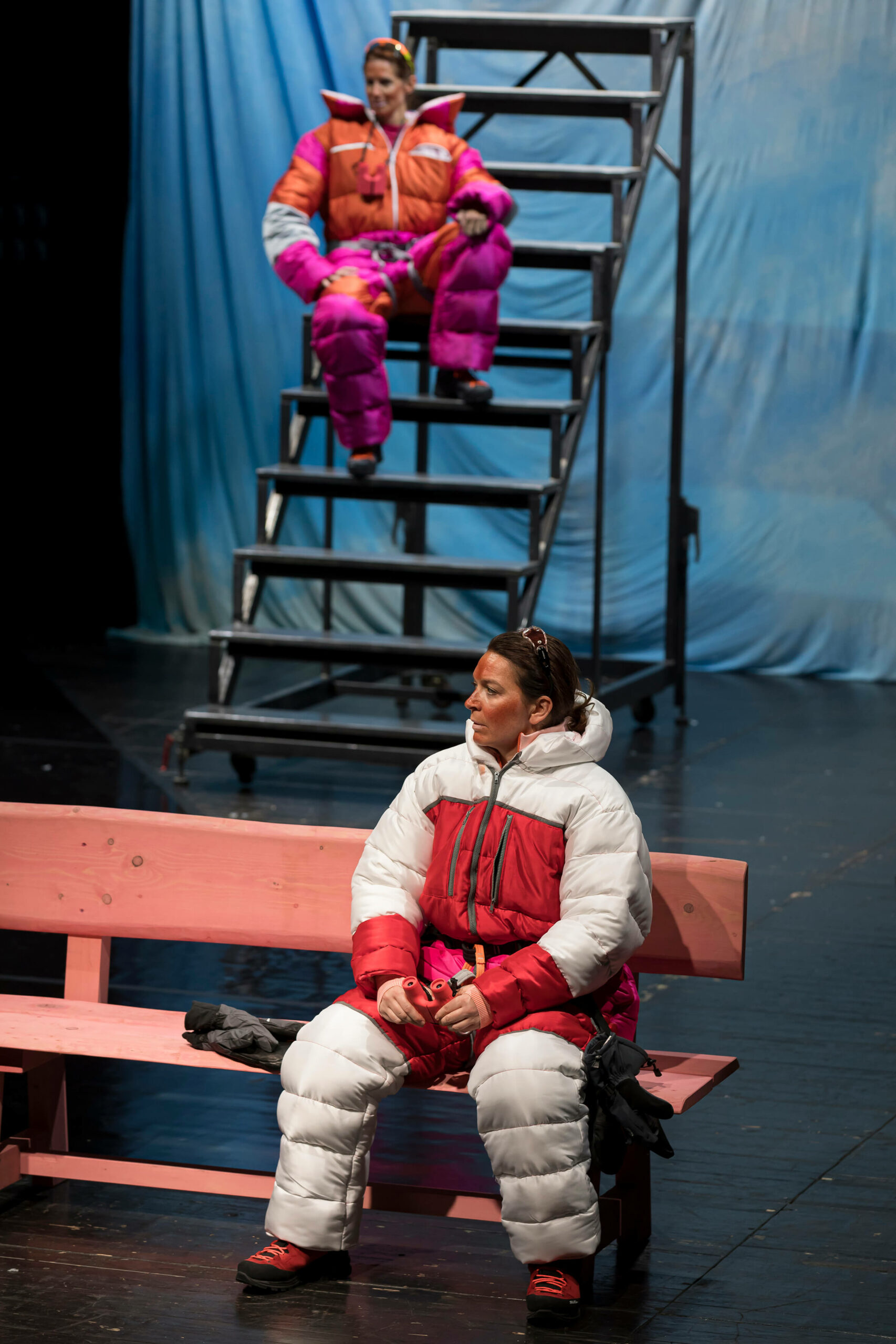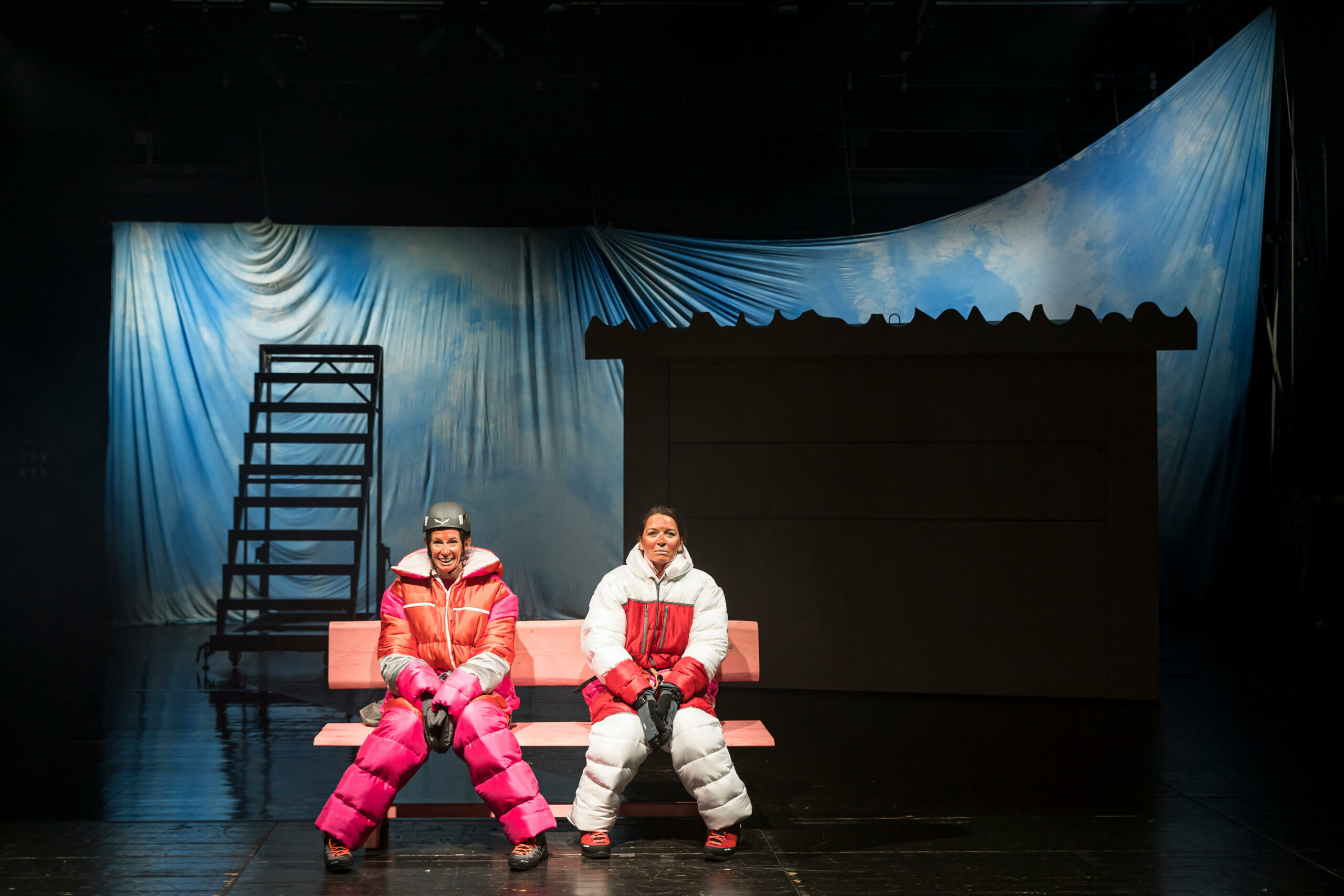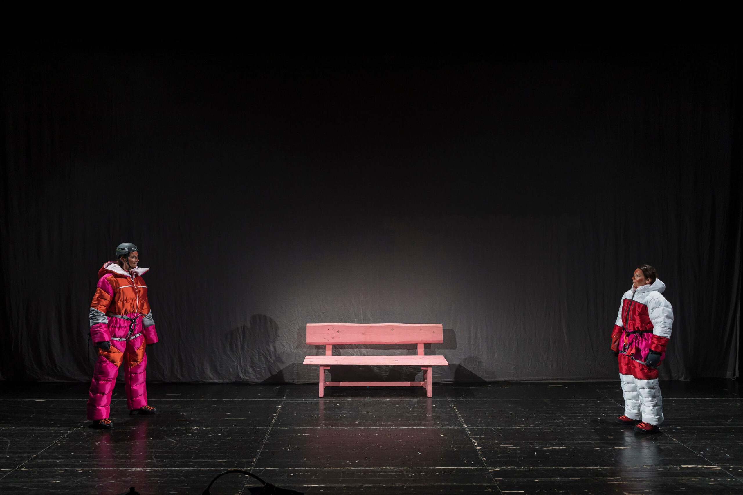Die preisgekrönte österreichische Dramatikerin Teresa Dopler entwickelt in ihrem aktuellen Stück ein gleichermaßen erschreckendes wie komisches Zukunftsszenario zwischen romantischer Schönheit und globaler Zerstörung: „Für mich ist diese Bergwelt vor allem eine fiktive Welt, ein geschlossenes Universum und im Grunde auch ein sehr absurder Schauplatz. Die Pfade, Gipfel und Täler gibt es zwar alle wirklich, aber die Distanzen und die Dimensionen sind seltsam verschoben. Auch die Figuren sind ja keine herkömmlichen Bergsteiger:innen. Sie sind in den Bergen unterwegs, seit sie sich erinnern können, und ich habe fast den Eindruck, dass man es hier mit einer eigenen Spezies zu tun hat, als wären sie irgendwann einmal aus einer Felsspalte gekrochen.“
