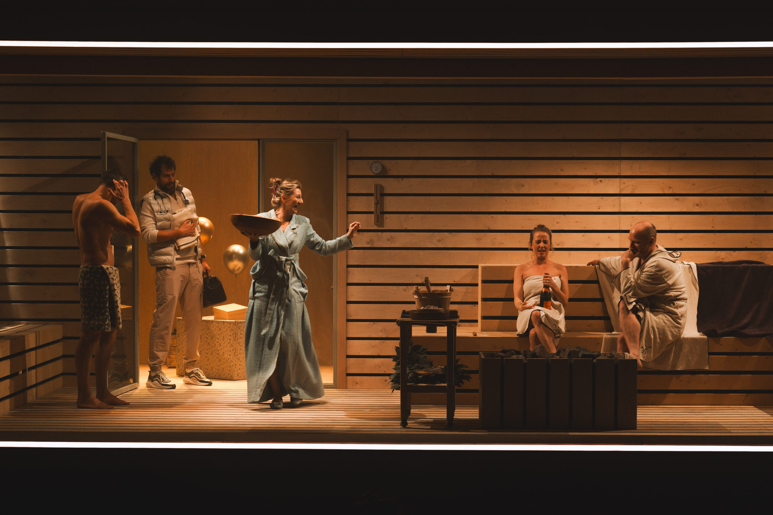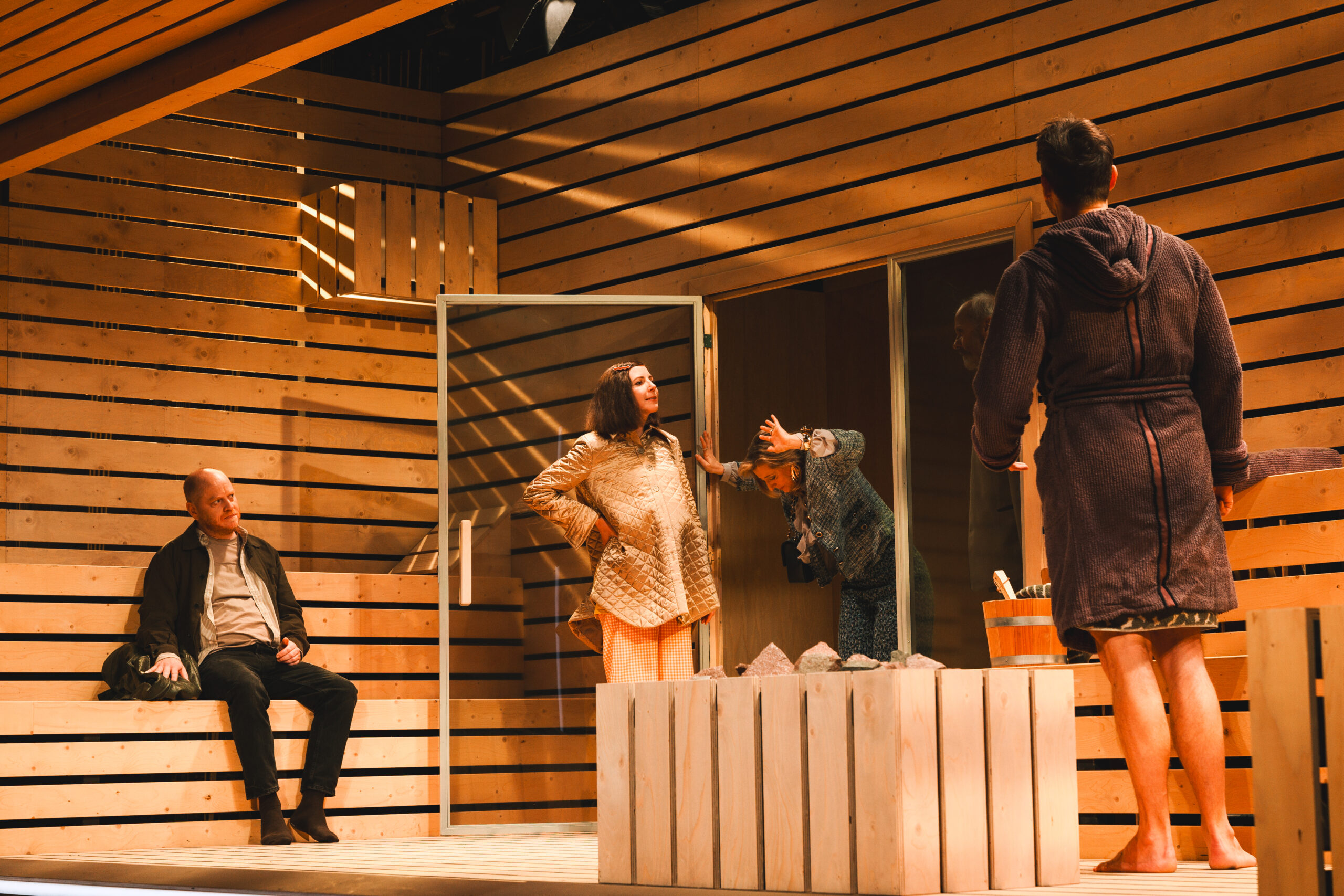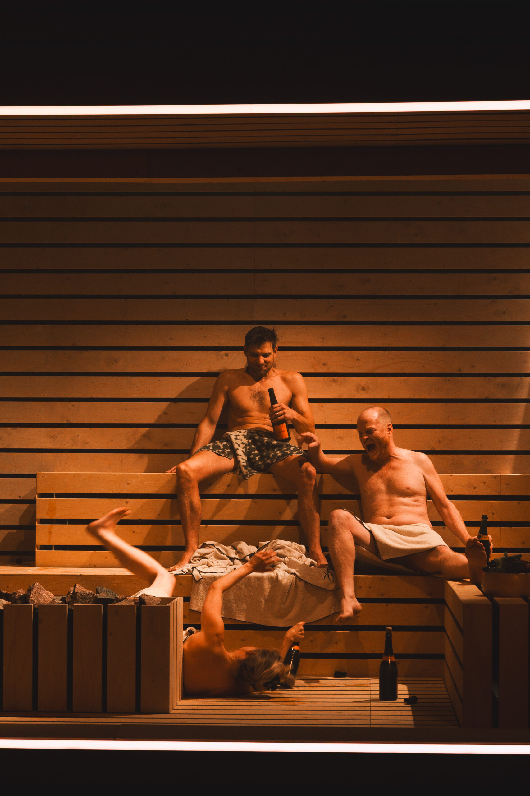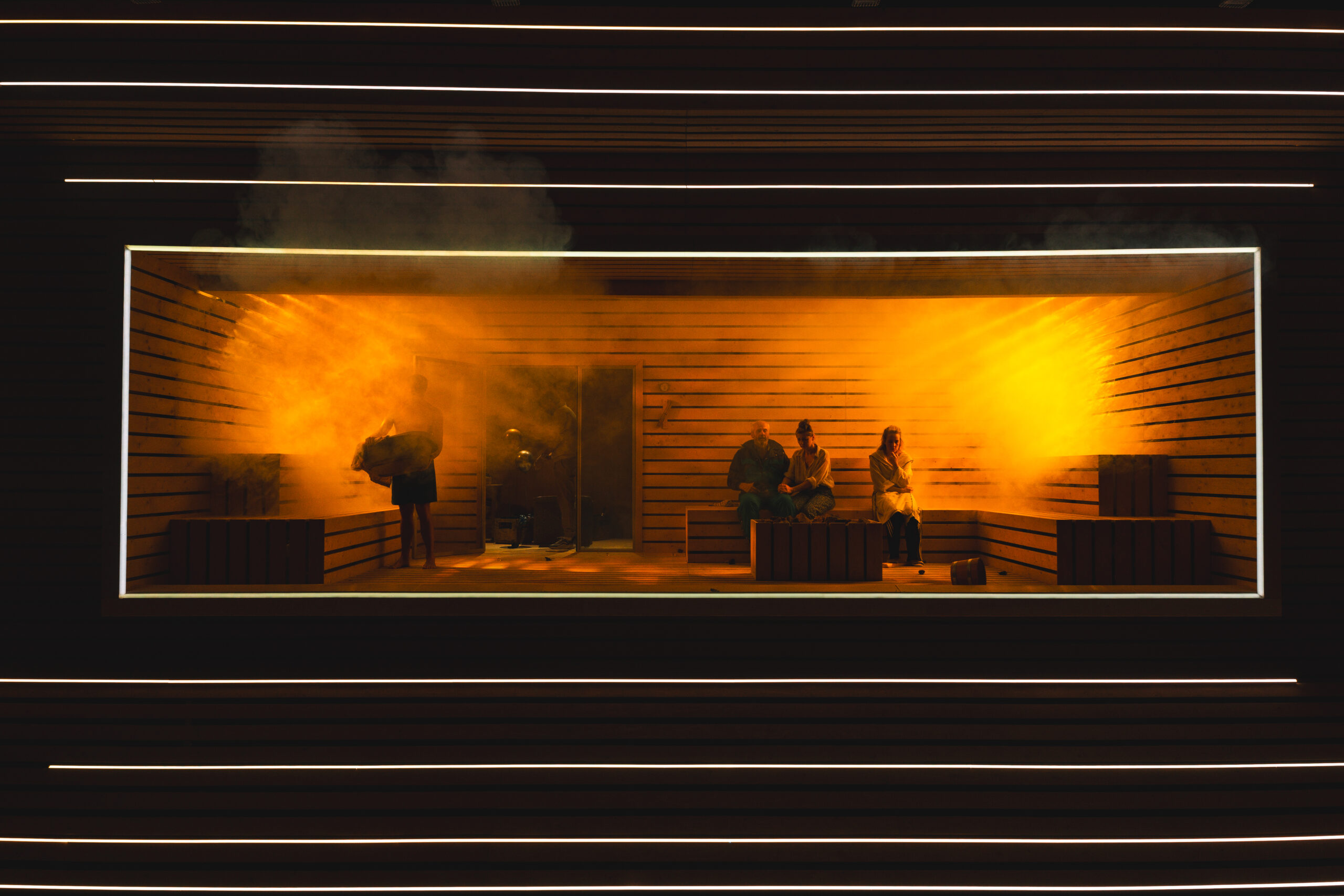 Schwiegersohn Thomas soll die Autoteile Firma der Krauses übernehmen. Seine Frau Martha, über der laut Hausarzt Schimmelpfennig: „ein großer schwarzer Hund das heulend Elend“ sitzt, ist überfällige Erstgebärende und die Familie droht durch Alkohol und Kommunikationsunfähigkeit zu kollabieren. Plötzlich taucht Thomas‘ alter Freund und Journalist Alfred auf und hinterfragt alles. Sarantos Zervoulakos pflanzt dieses Soziale Drama in eine Sauna, in der das Familienschicksal besiegelt wird.