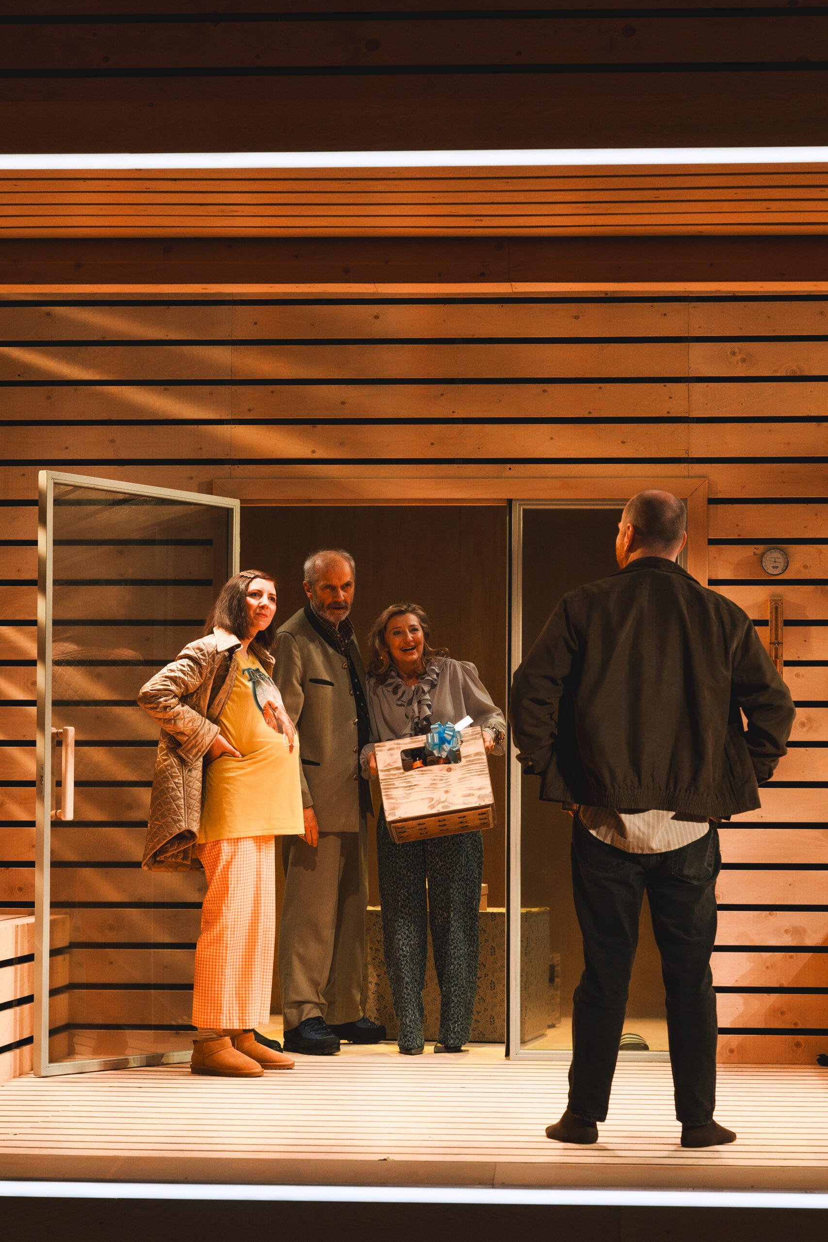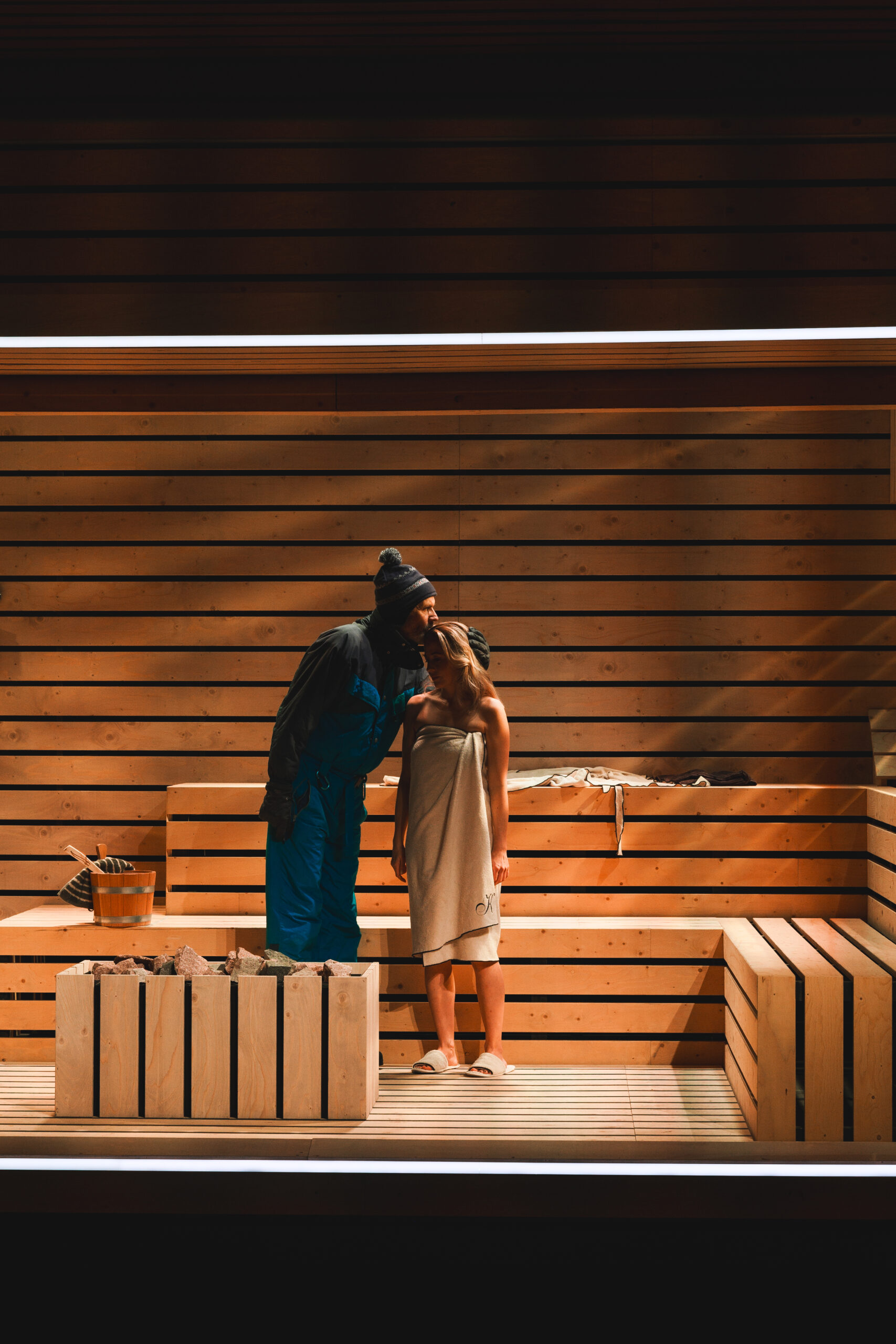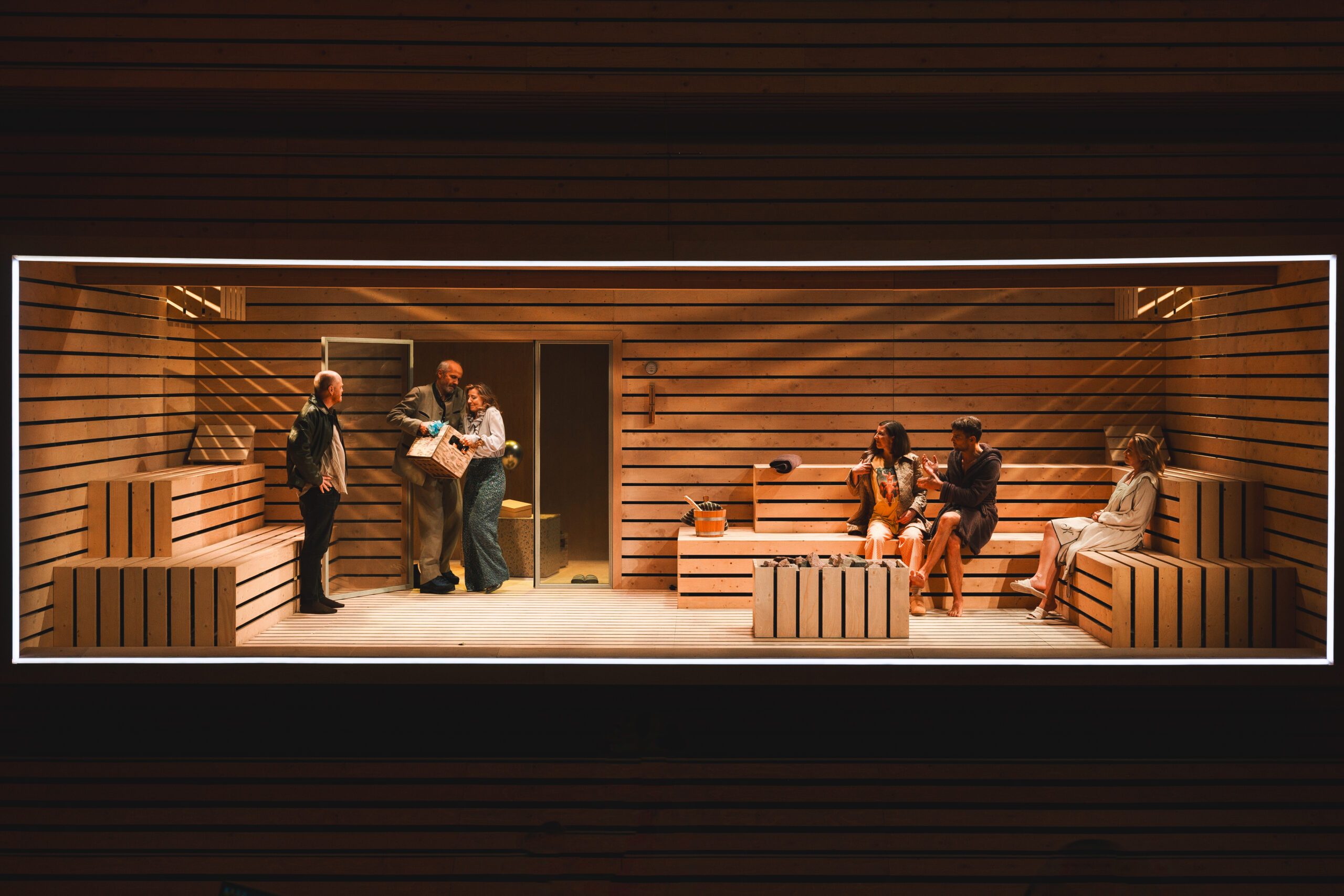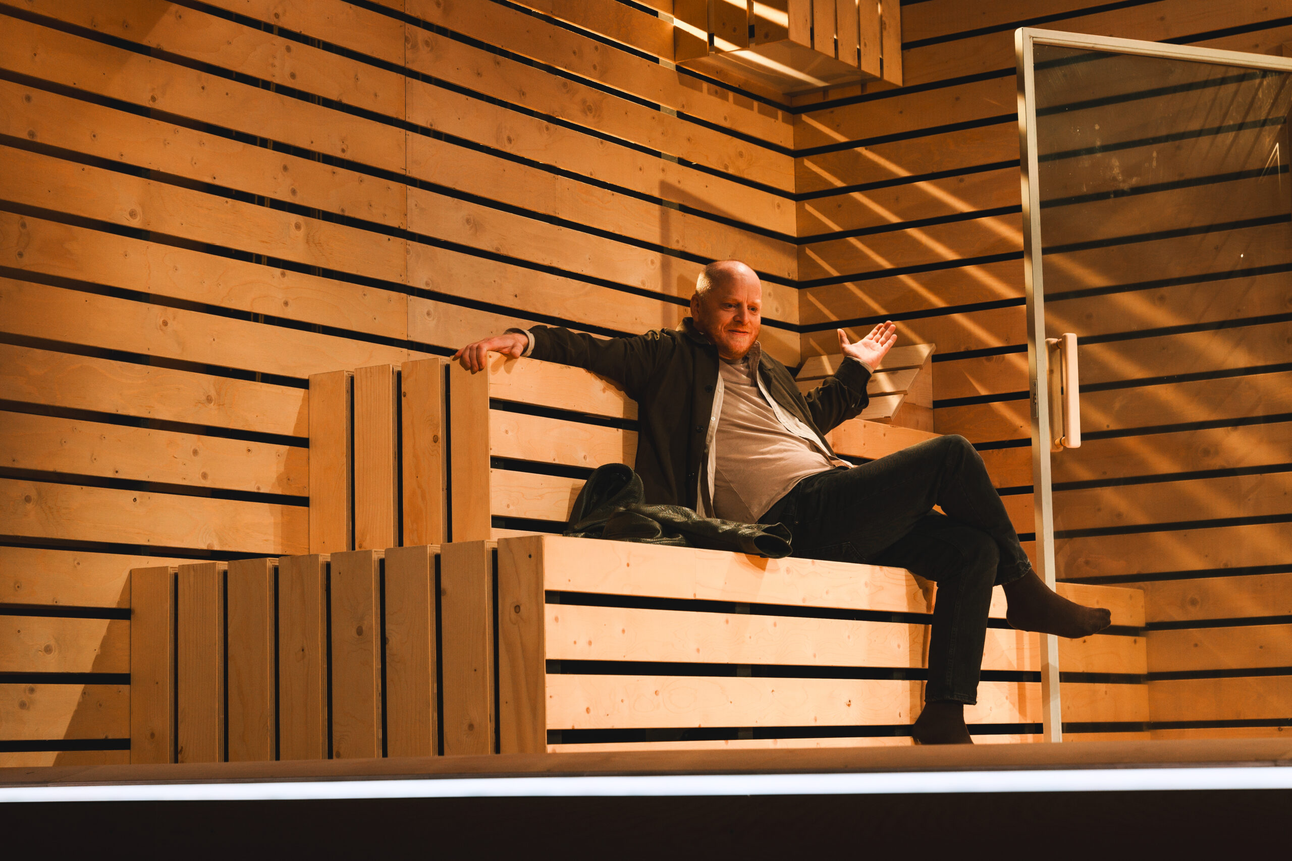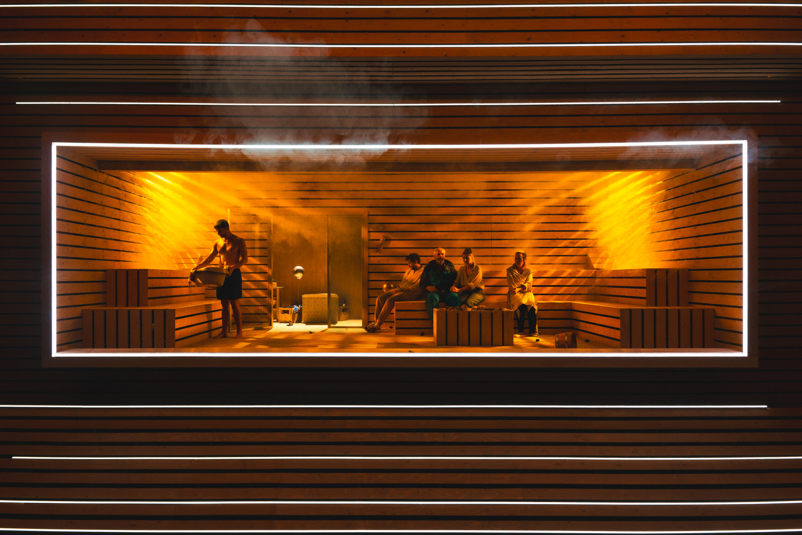 Schwiegersohn Thomas soll die Autoteile Firma der Krauses übernehmen. Seine Frau Martha, über der laut Hausarzt Schimmelpfennig: „ein großer schwarzer Hund das heulend Elend“ sitzt, ist überfällige Erstgebärende und die Familie droht durch Alkohol und Kommunikationsunfähigkeit zu kollabieren. Plötzlich taucht Thomas‘ alter Freund und Journalist Alfred auf und hinterfragt alles. Sarantos Zervoulakos pflanzt dieses Soziale Drama in eine Sauna, in der das Familienschicksal besiegelt wird.