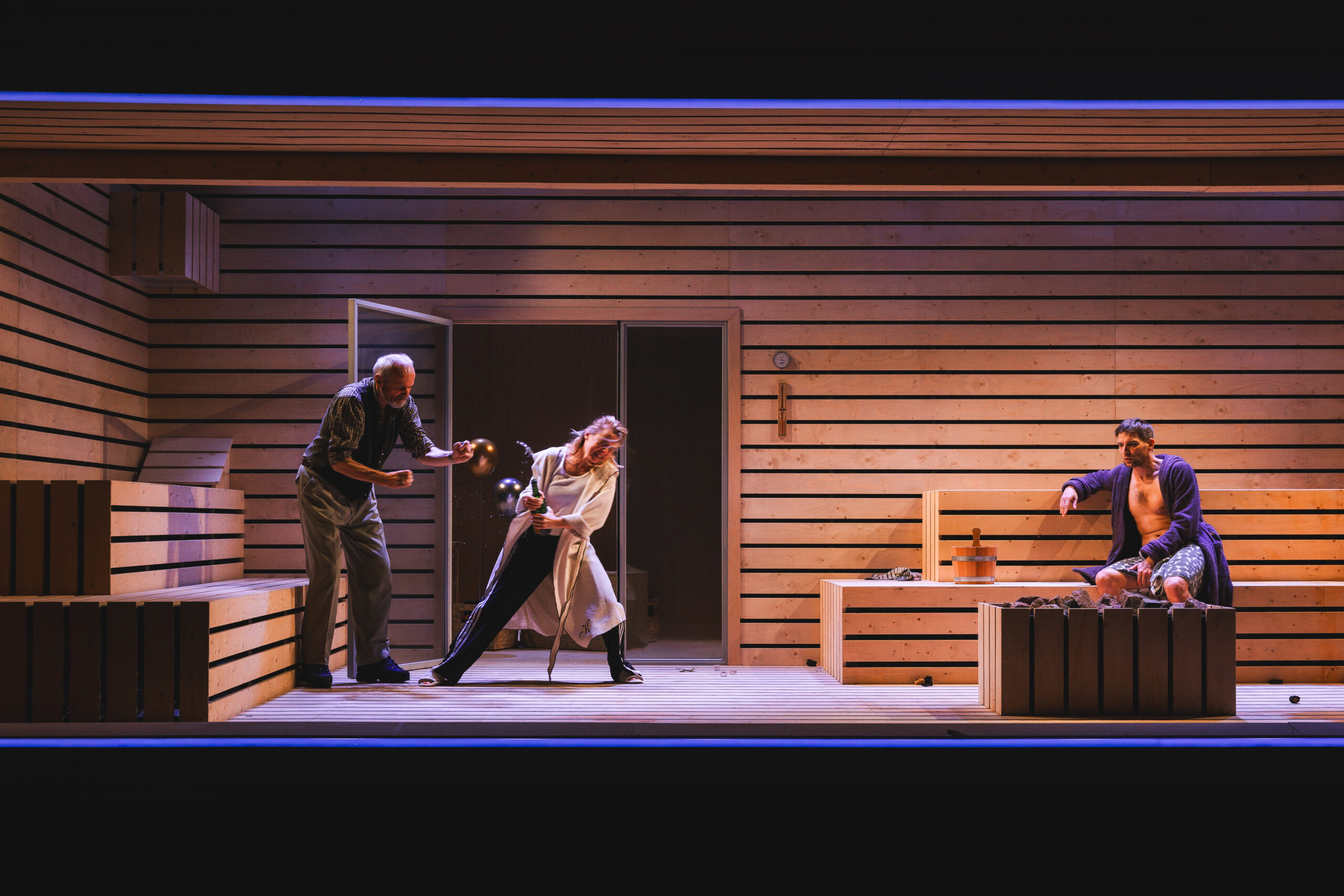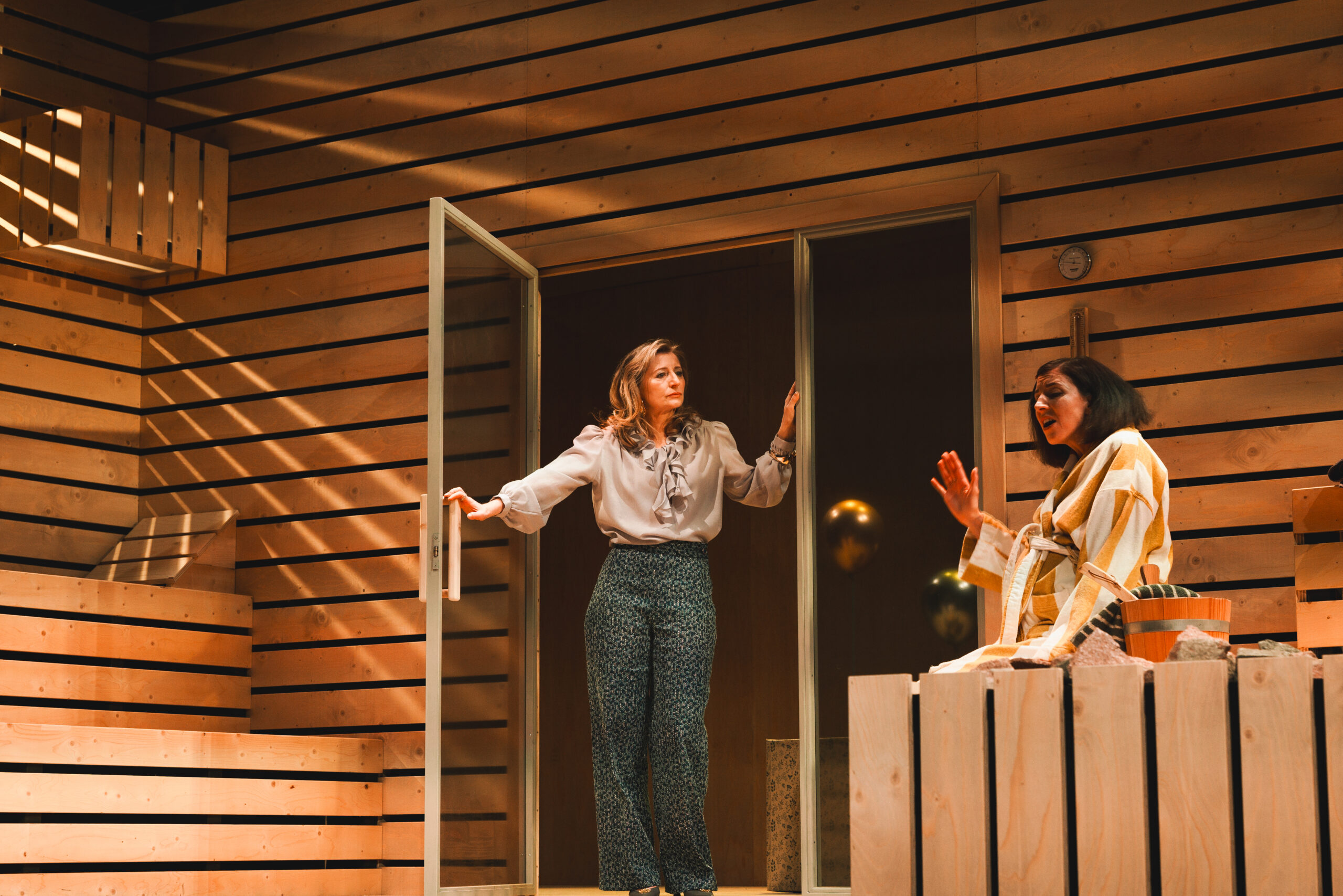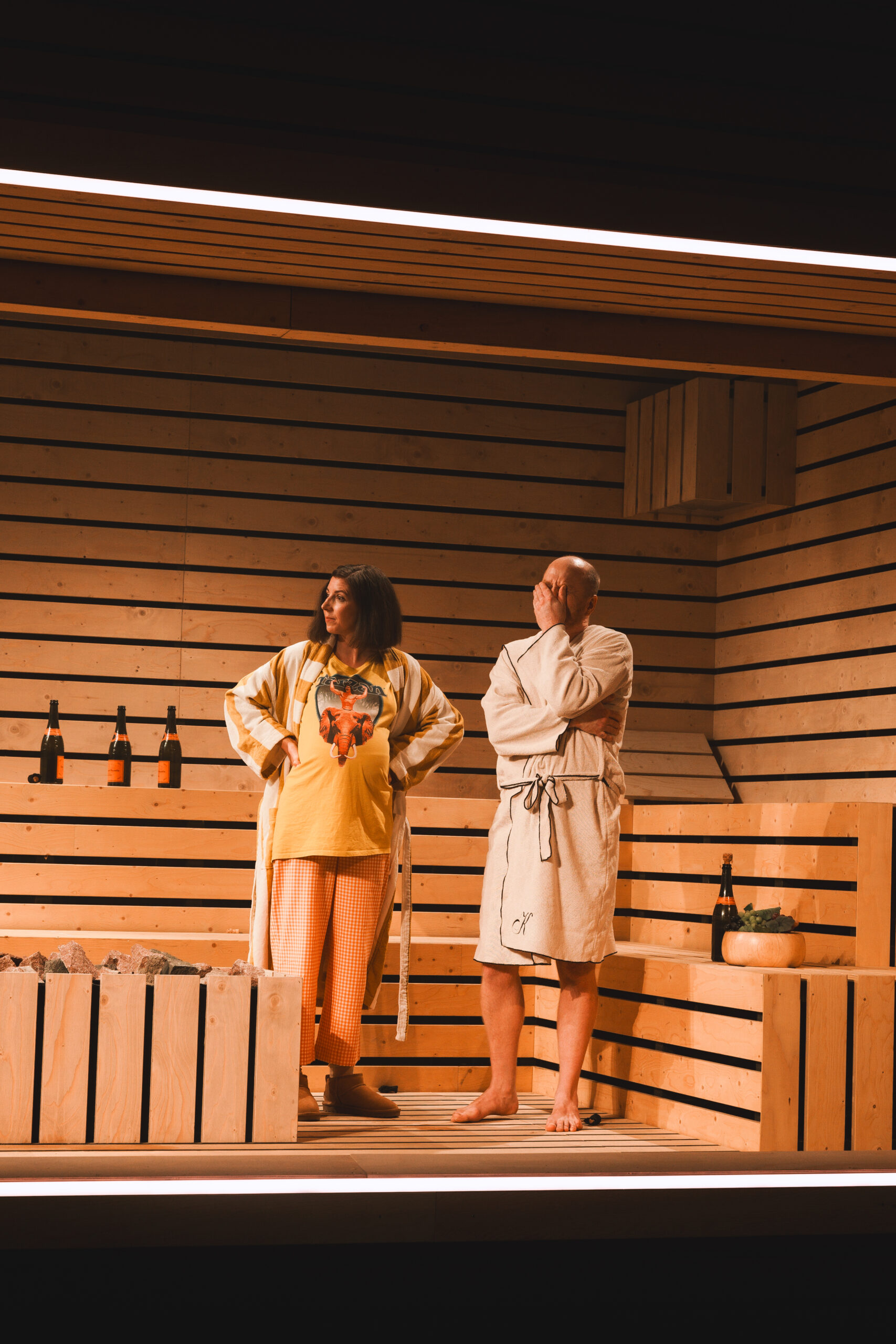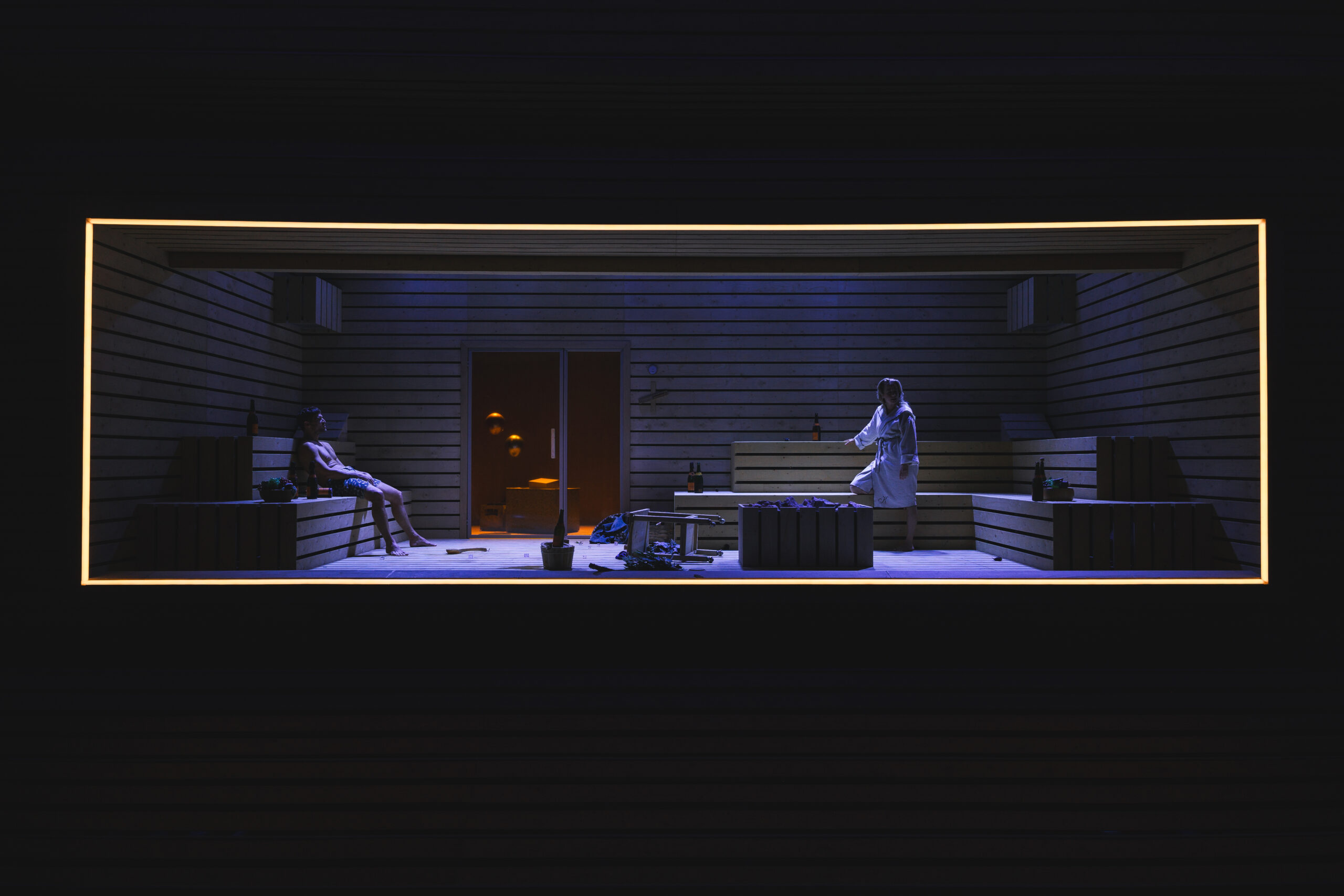 Schwiegersohn Thomas soll die Autoteile Firma der Krauses übernehmen. Seine Frau Martha, über der laut Hausarzt Schimmelpfennig: „ein großer schwarzer Hund das heulend Elend“ sitzt, ist überfällige Erstgebärende und die Familie droht durch Alkohol und Kommunikationsunfähigkeit zu kollabieren. Plötzlich taucht Thomas‘ alter Freund und Journalist Alfred auf und hinterfragt alles. Sarantos Zervoulakos pflanzt dieses Soziale Drama in eine Sauna, in der das Familienschicksal besiegelt wird.