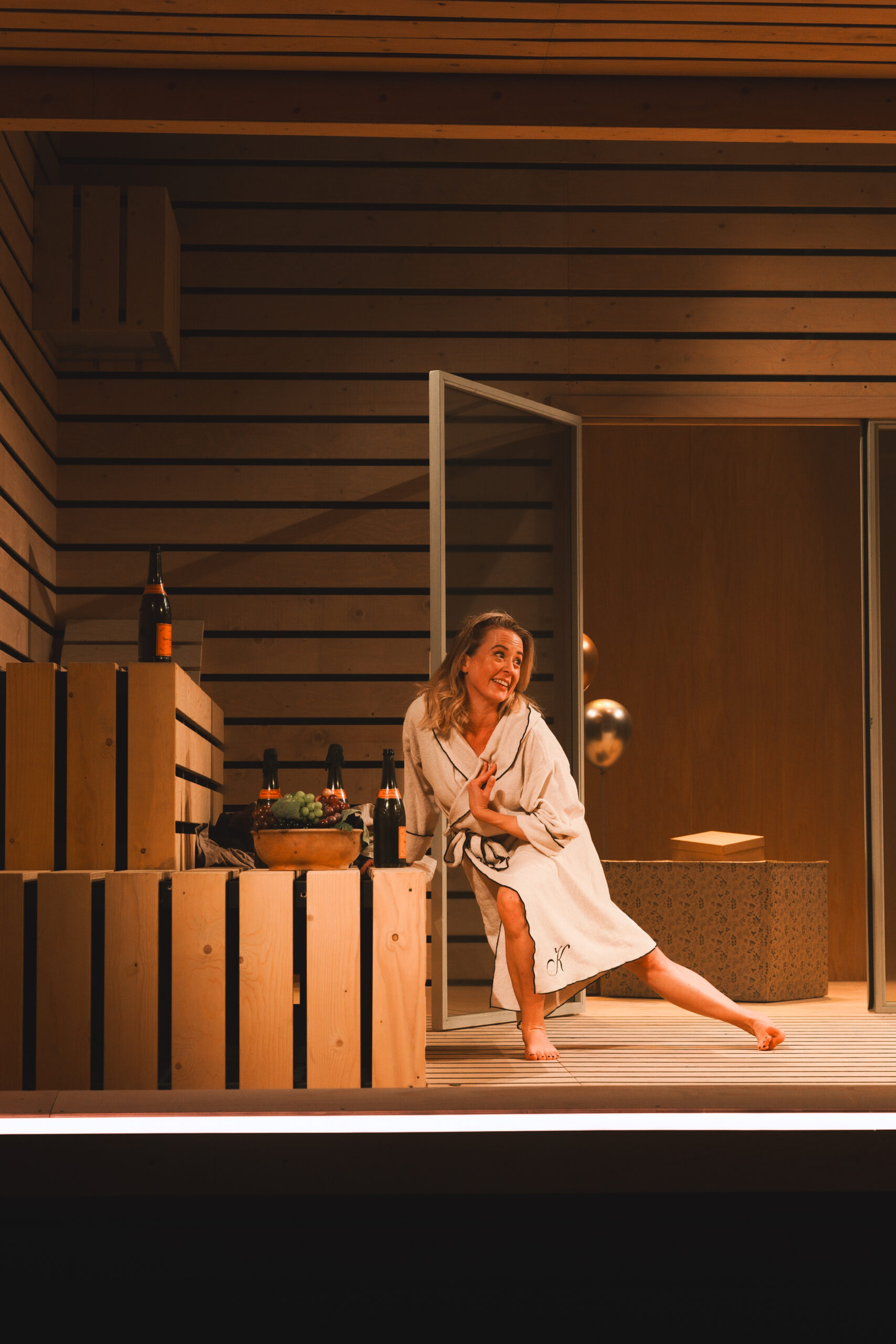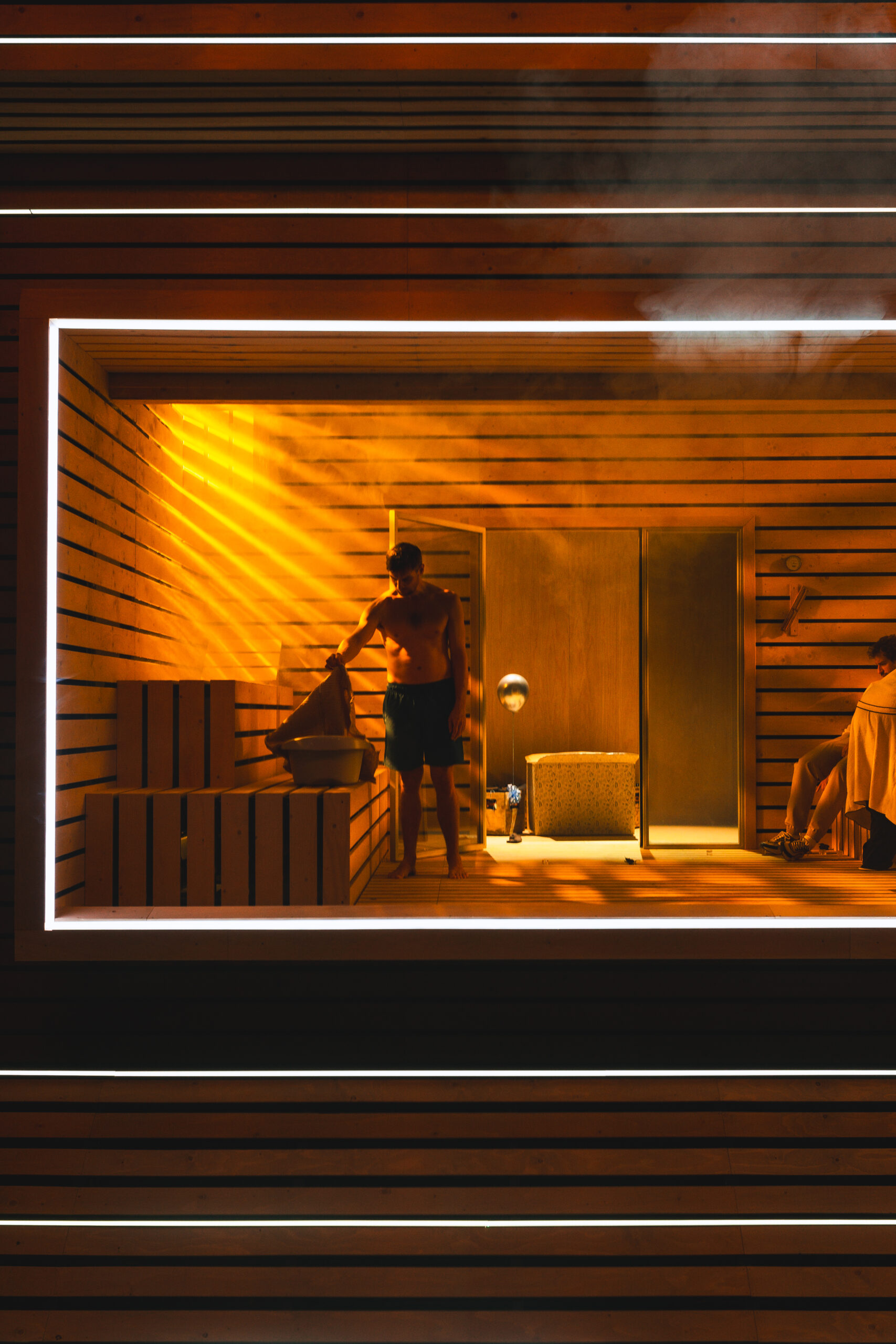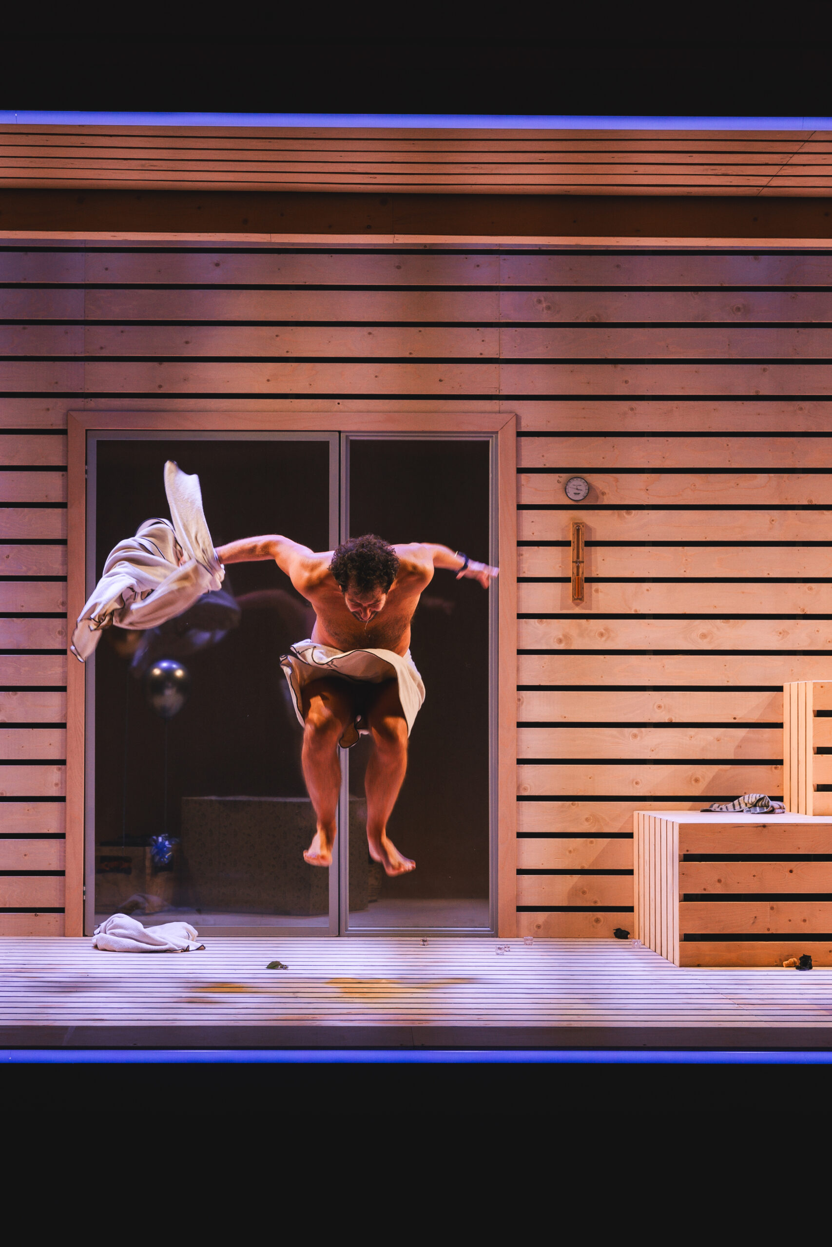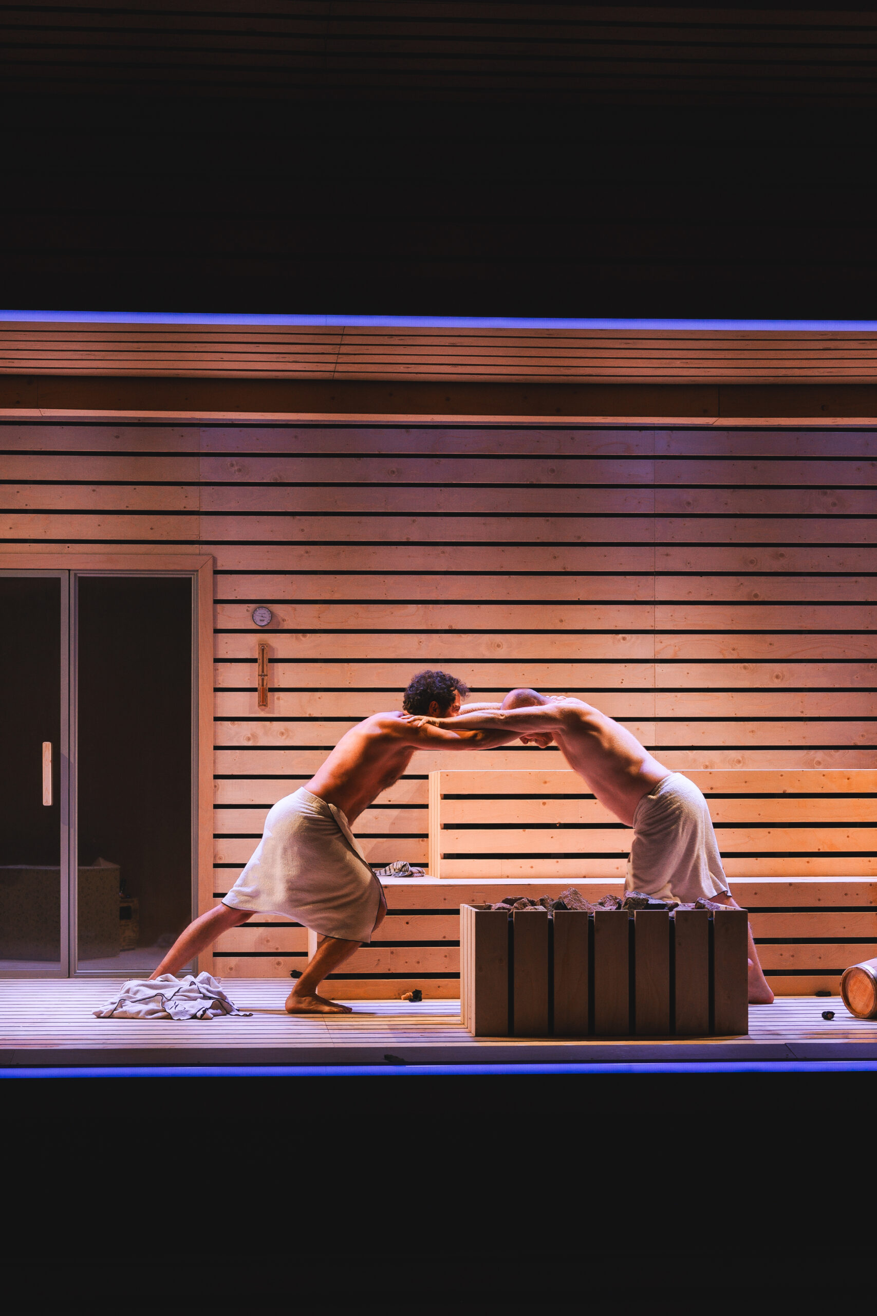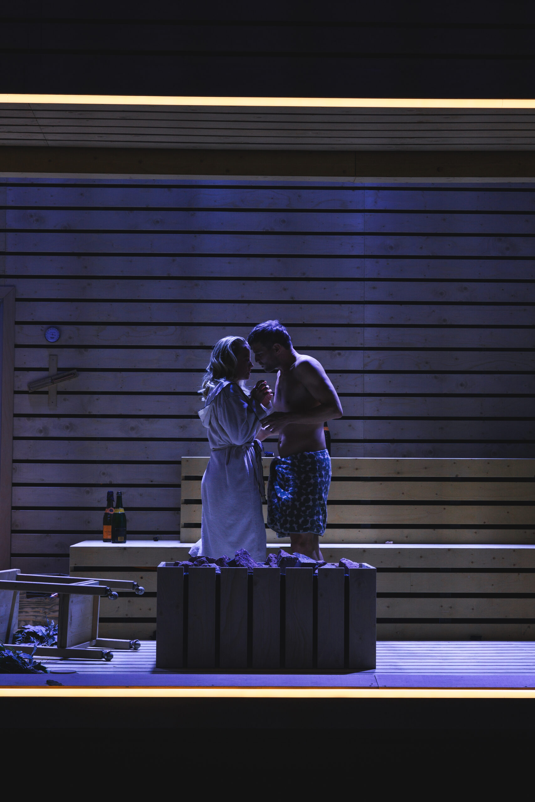 Schwiegersohn Thomas soll die Autoteile Firma der Krauses übernehmen. Seine Frau Martha, über der laut Hausarzt Schimmelpfennig: „ein großer schwarzer Hund das heulend Elend“ sitzt, ist überfällige Erstgebärende und die Familie droht durch Alkohol und Kommunikationsunfähigkeit zu kollabieren. Plötzlich taucht Thomas‘ alter Freund und Journalist Alfred auf und hinterfragt alles. Sarantos Zervoulakos pflanzt dieses Soziale Drama in eine Sauna, in der das Familienschicksal besiegelt wird.
